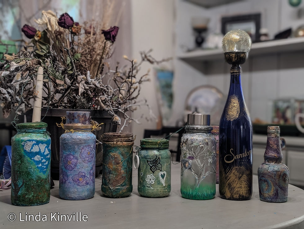 I'm also incredibly passionate about transforming everyday items into unique works of art. There's a special joy in taking what's around us and giving it new life. My latest creations are solar lanterns, featuring a uniquely textured painted exterior applied to glass jars. These enchanting lanterns aren't just beautiful decorative pieces for your trees or patio during the day; they also cast a warm, inviting glow at night.